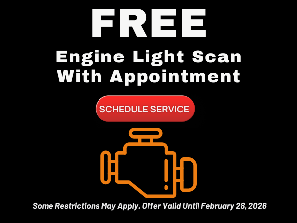FREE Engine Light Scan FREE Engine Light Scan – With Appointment Valid until January 31, 2026 Click here to book an appointment. Back Share on Facebook - FREE Engine Light Scan (opens in a new window)Share on Twitter - FREE Engine Light Scan (opens in a new window)Share on LinkedIn - FREE Engine Light Scan (opens in a new window)