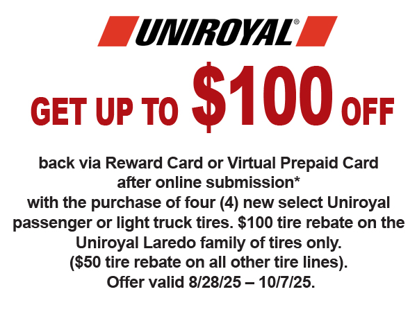 Get Up To $100 back via Reward Card or Virtual Prepaid Card after online submission, with the purchase of four (4) new select Uniroyal passenger or light truck tires.